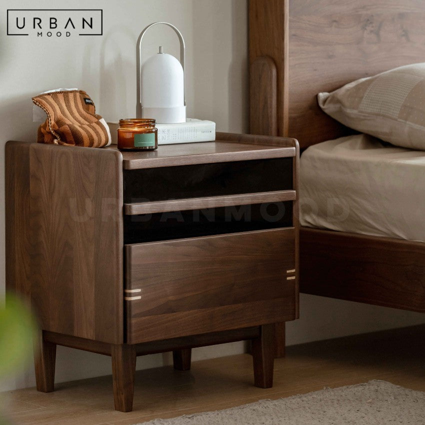 Built from authentic black walnut wood, the ABBEY nightstand offers a well-balanced design marrying durability and organic beauty. Supported by tapered wooden legs, this side companion comes with deep drawers for storage of nightly essentials. Its clean-lined silhouette makes it ideal for bedrooms, guest rooms, or living spaces. The walnut finish highlights unique grain patterns, giving each piece a character of its own.