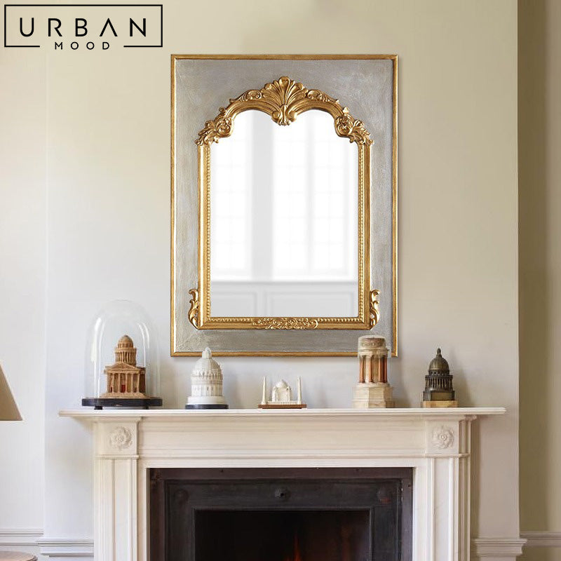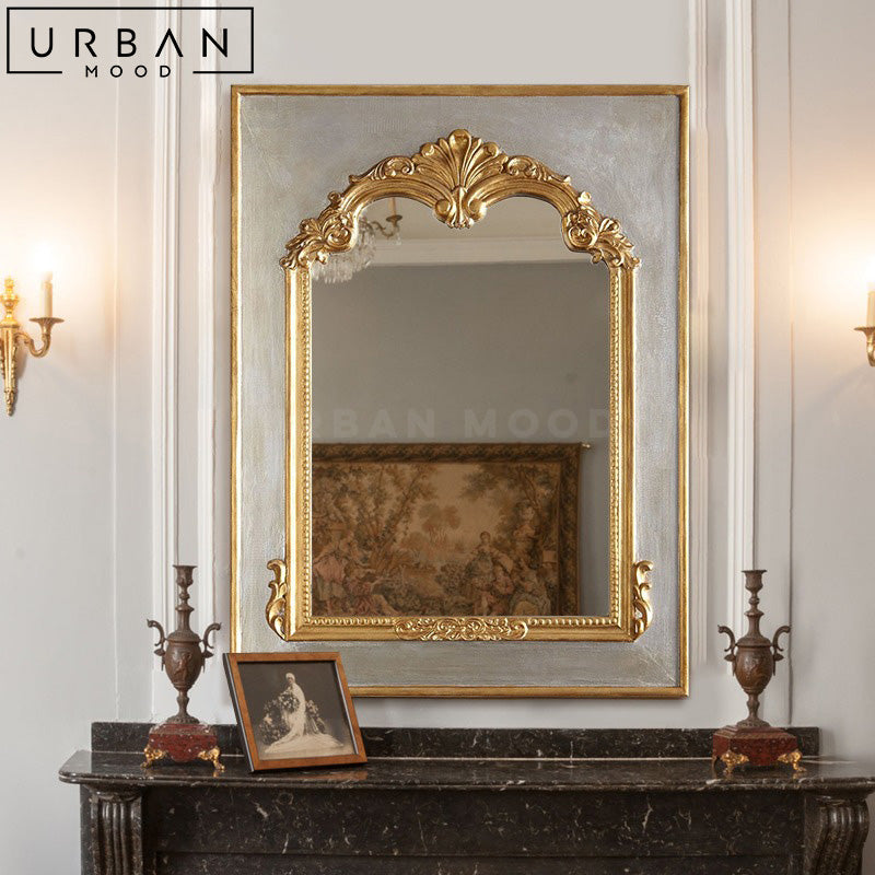 Transform any room of your choice into a regal retreat with our MUSEA wall mirror. This exquisite piece features intricate gold carvings adorning its frame, adding a touch of timeless charm to any room. Whether you're looking for an accent mirror in your entryway or a vanity mirror for a touch of vintage glamour, this accent mirror will make a statement with its ornate design. Transport family and guests to a Victorian sanctuary and complete the look with our SCHULL standing lamp.