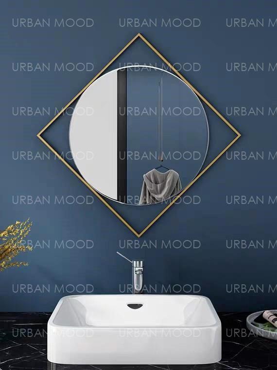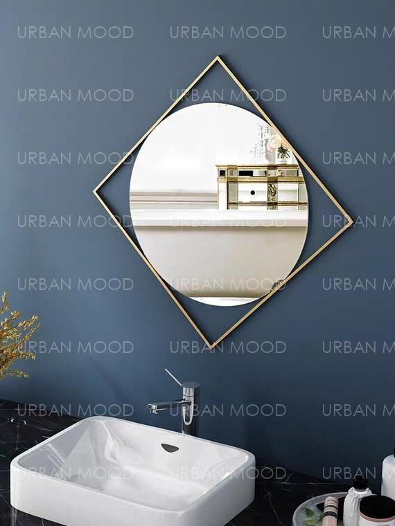 An accent mirror that will add luxury and dynamism to your bathroom or vanity space. Featuring a sleek and clean cut frameless round mirror with a square metal border in black or gold, this mirror will complement any home decor themes in style. Angle it to form a diamond shape for an eclectic touch.