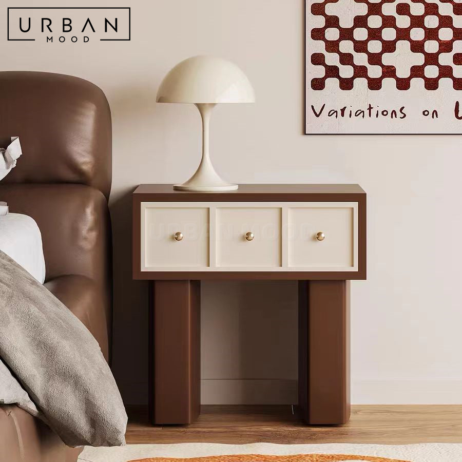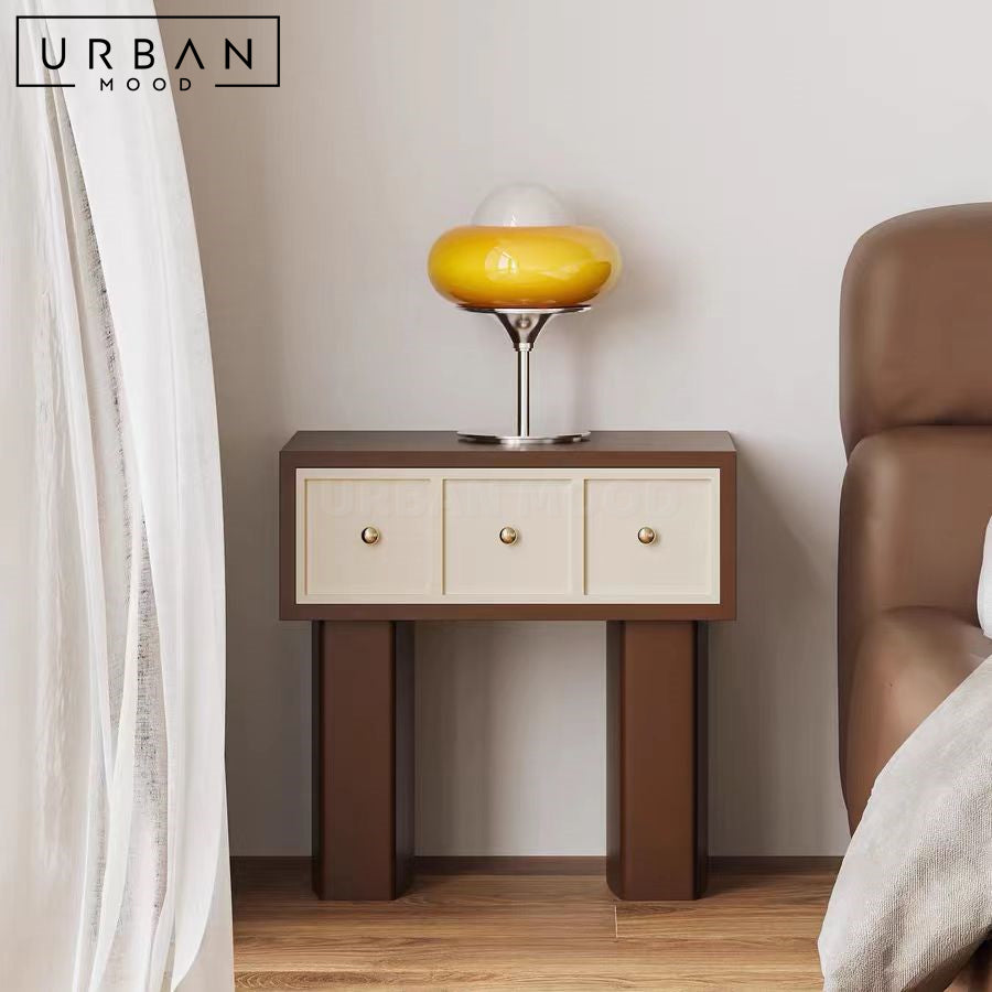 Add a touch of charm to your bedroom with our eclectic bedside table in a soothing neutral palette. This quaint piece features a single drawer adorned with stainless steel knobs, balanced on two pillars for legs. Its unique design adds a whimsical vibe to any modern, minimalist, Japandi, or Wabi Sabi inspired living room or bedroom.