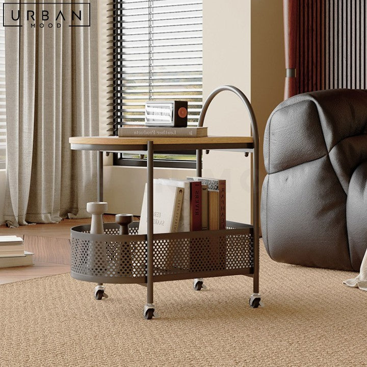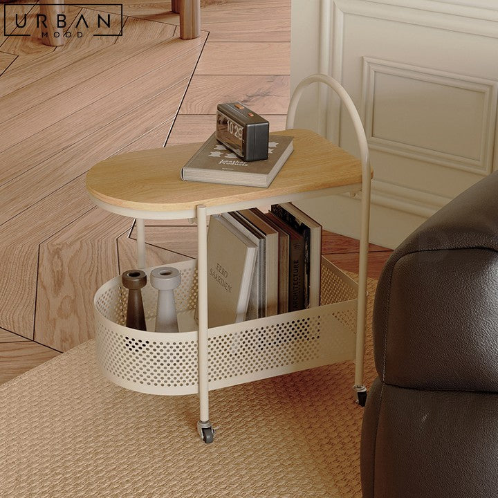 Versatility meets style with our mobile ESPIN side table, doubling as a utility basket and bar cart. Featuring a sturdy metal frame in black or white, this convenient piece is topped with a warm oak-colored tray and equipped with a metal basket below. The wheels enable effortless movement, making it perfect for living rooms, kitchens, or outdoor spaces. Use it as a side table, bar cart, or storage basket - its multifunctional design adapts to your needs. Elevate your home's functionality and aesthetics with this practical and chic mobile side table, perfect for modern living.