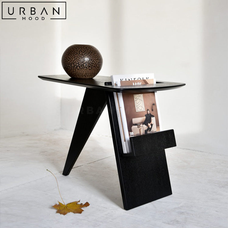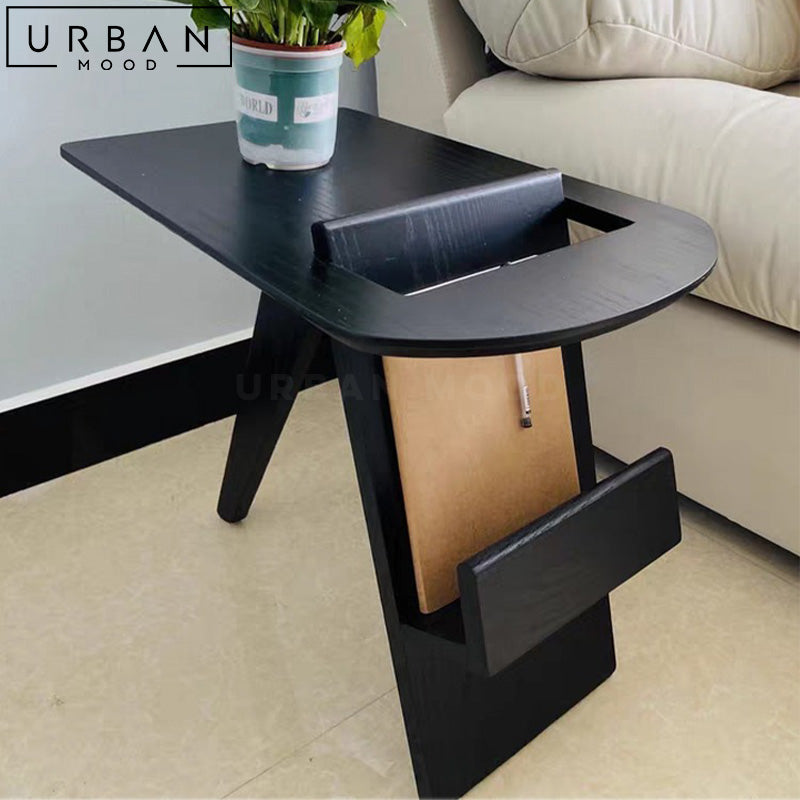 Crafted from premium pine wood in a cool matte black or warm oak finish, our MORIN side table features a sleek profile that enhances any modern, minimalist, or Japandi decor. The end table comes with a convenient nook, perfect for storing magazines and books, keeping your essentials within arm's reach. With its timeless design, this side table is a must-have addition that brings both style and organization to any living room, bedroom, or office lounge.