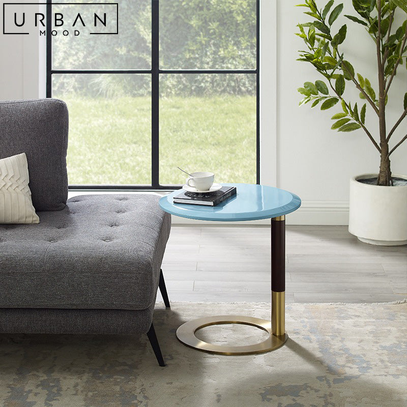 Crafted from the finest walnut, our NAYA end table features a well-rounded table surface that allows you to place your mugs, books, or remote controllers. Balanced upon a sleek metal frame that extends to a round stainless steel base, this end table is both sleek and multifunctional. Choose from various colours to complement your modern, classic, victorian, or rustic living room interior.