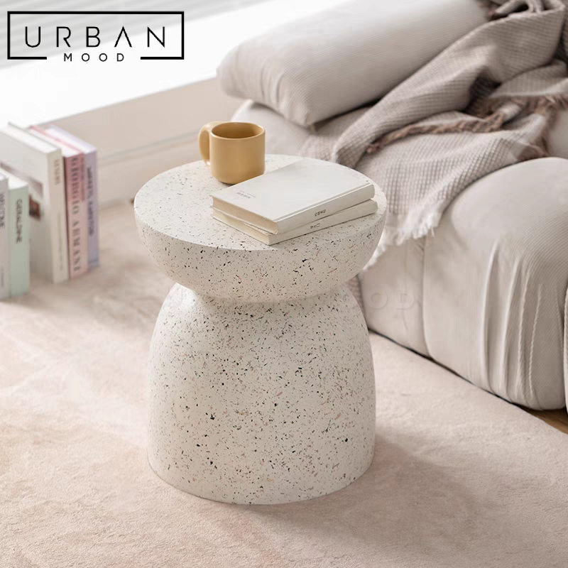 Crafted from high quality magnesium mud, our NUKE side table features an hourglass wrapped in fine terrazzo print. An accent piece for modern or eclectic living spaces, this side table will prove to be multifunctional as a nightstand or end table. Complete the look with our low pile rugs for a soothing, minimalist touch.