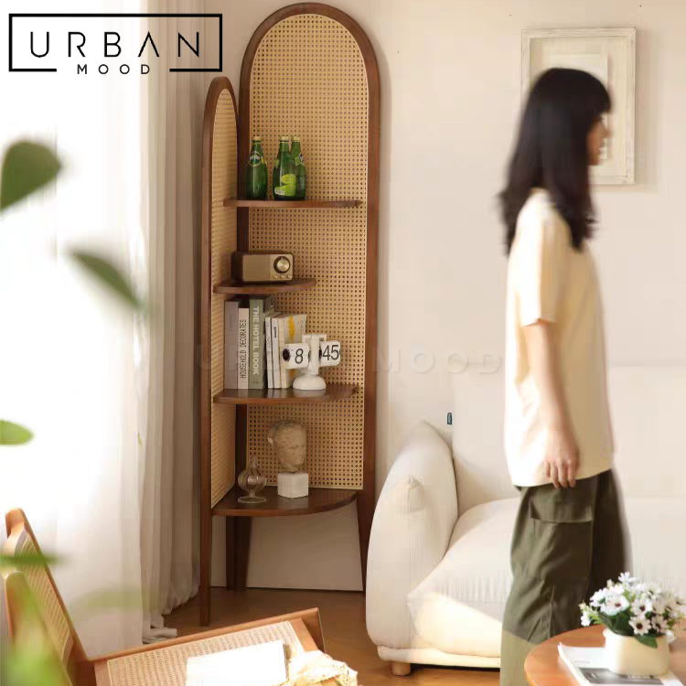 A discreet yet stylish corner shelving unit that takes up little space and frees up your spatial footprint at the same time. The JACKIES standing shelf features four tiers of display space, crafted from pine wood and handwoven rattan which ensures the stability of the furniture for long years of usage. A beautiful essential or decorative piece for retro, vintage, or country inspired rooms.