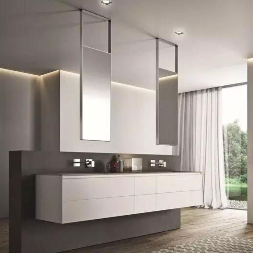 A unique and sleek bathroom mirror that suspends from the ceiling, lending your bathroom or walk in wardrobe an air of hotel luxury and postmodern beauty.