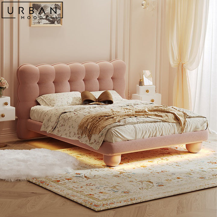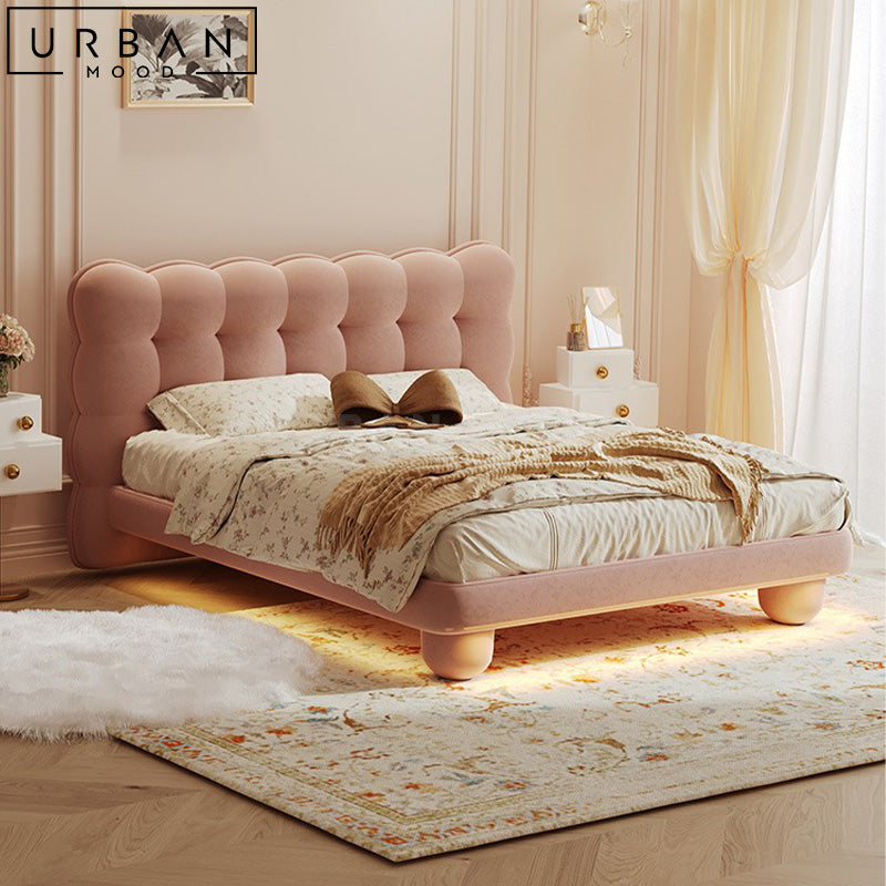 Constructed from a solid pine wood internal structure and upholstered in lush boucle fabric, you will love the tufted detailing on our AGLIS bed head. The bedframe resembles a fluffy cloud, allowing for maximum comfort on rainy nights in. Balanced upon round metal bearings, this bedframe design is both practical and luxurious. This anchor piece will capture attention in modern, classic, victorian or hotel inspired interior themes.