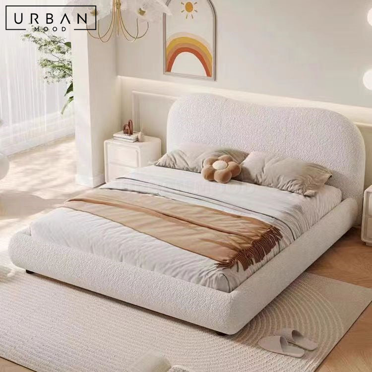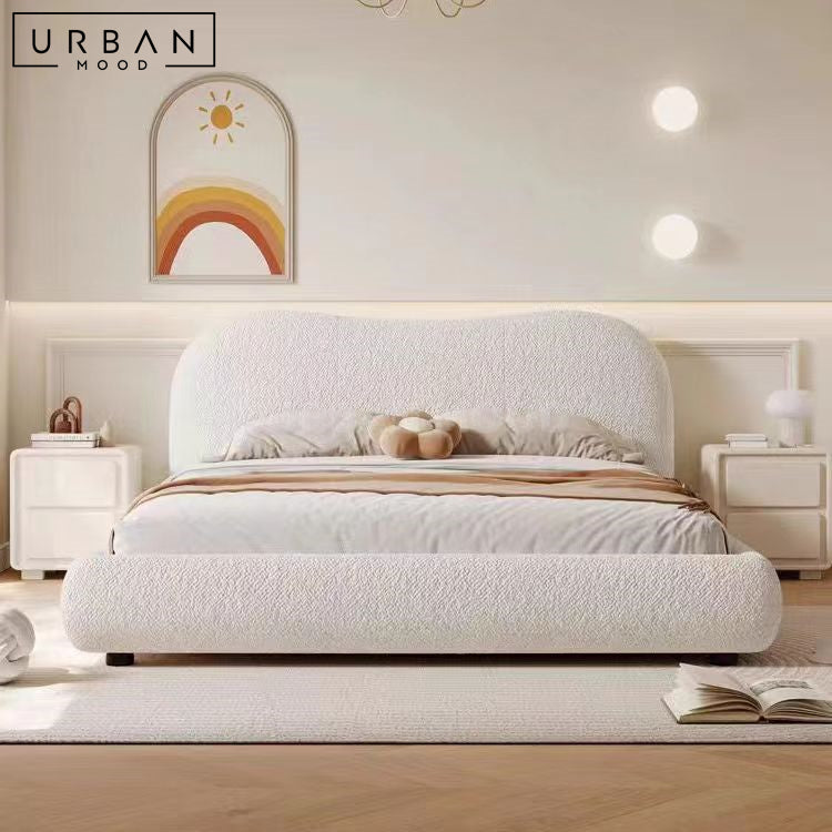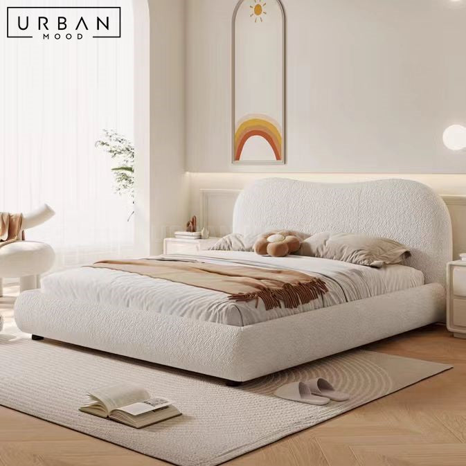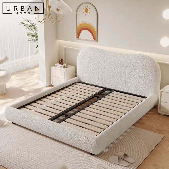 Wrapped in soft and luscious boucle fabric, our ETERNITY bedframe exudes sophistication and coziness in equal measure. The headboard's cloud-shaped outline adds a touch of unique style, making it an instant focal point in any bedroom. Transform your sleep space into a cozy retreat, and complete the minimalist or hygge look with our NOTE bedside table and CLOUDY lamp.
