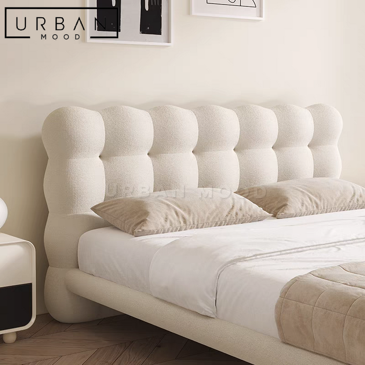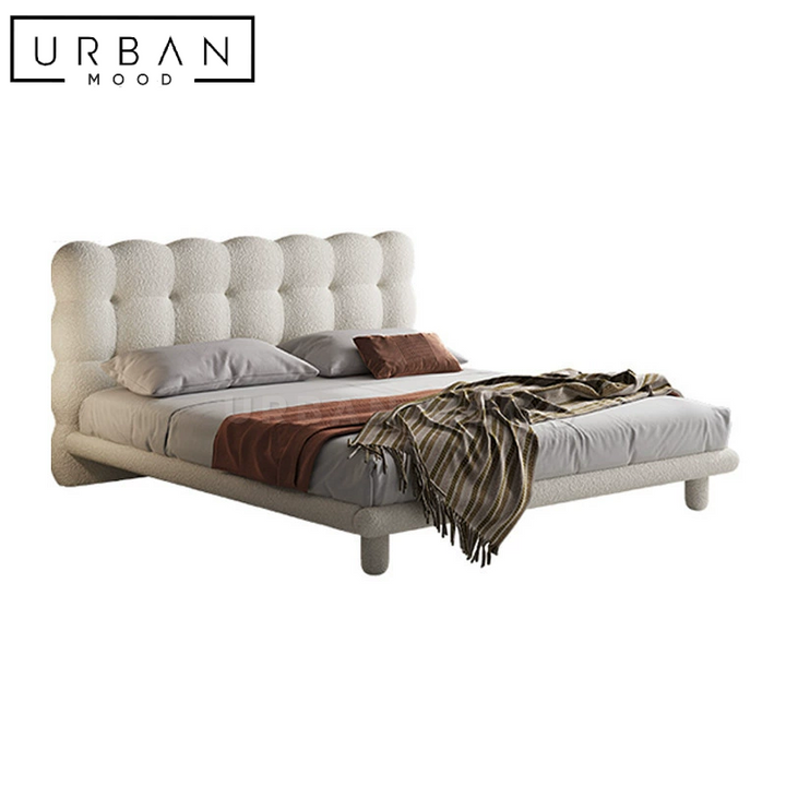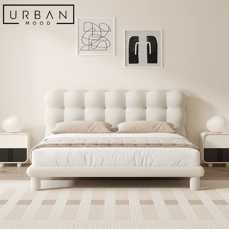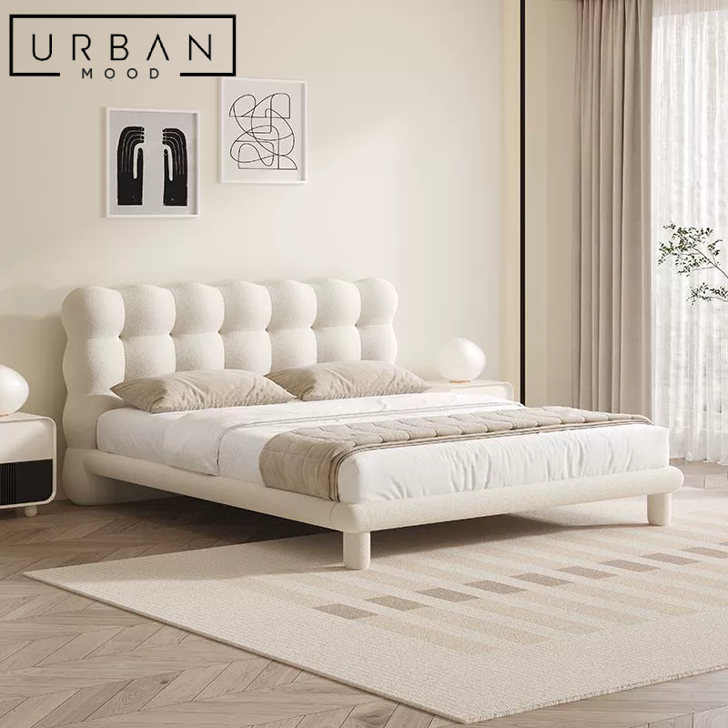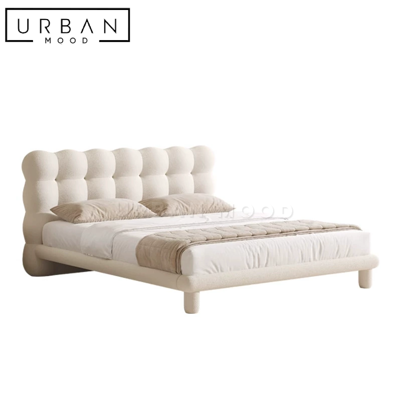 Constructed from a solid pine wood internal structure and upholstered in lush boucle fabric, you will love the tufted detailing on the bed head. The bedframe resembles a fluffy cloud, allowing for maximum comfort on rainy nights in. A practical yet luxurious design that will be the envy of guests, this bedframe will be the anchor piece in modern, classic, victorian or hotel inspired interior themes.