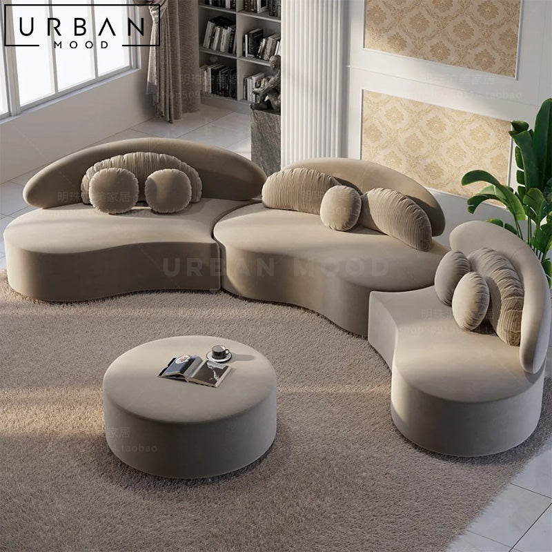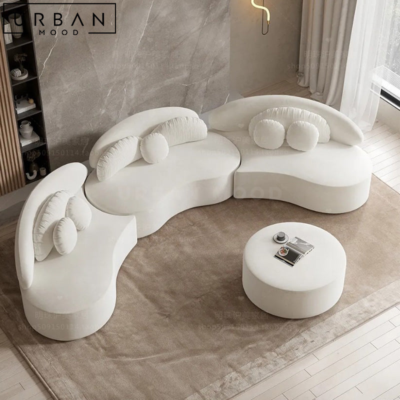An unconventional choice, our MENO bouclé sofa is a whimsical addition to any living space or office lounge. For larger families, its unique curved shape allows it to form a semi-circle, comfortably accommodating up to 4 people. This low maintenance couch sits firmly on the ground without raised legs. Resembling a fluffy cloud, its rounded silhouette adds a touch of whimsy and cuteness to your decor. Its bold design makes it a conversation starter and a focal point in any room. Perfect for both contemporary and eclectic interiors, this sofa's playful charm complements modern, minimalist, or Wabi Sabi interiors.