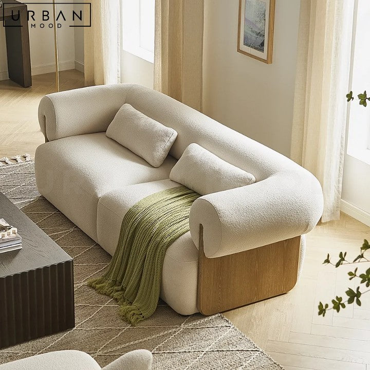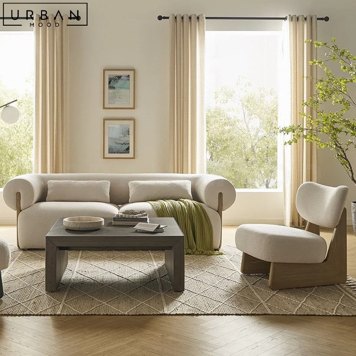 Embody the essence of Japandi style with our NAVYA boucle sofa, featuring a sturdy pine wood frame in a warm teak finish. The entire backrest is wrapped in soft, textured boucle fabric, creating a cozy and inviting atmosphere. The boucle fabric's subtle sheen and organic texture add depth and visual interest, while the teak finish brings warmth and sophistication. This sofa's clean lines, minimalist silhouette, and plush comfort make it perfect for modern living rooms seeking a harmonious blend of Japanese and Scandinavian design.
