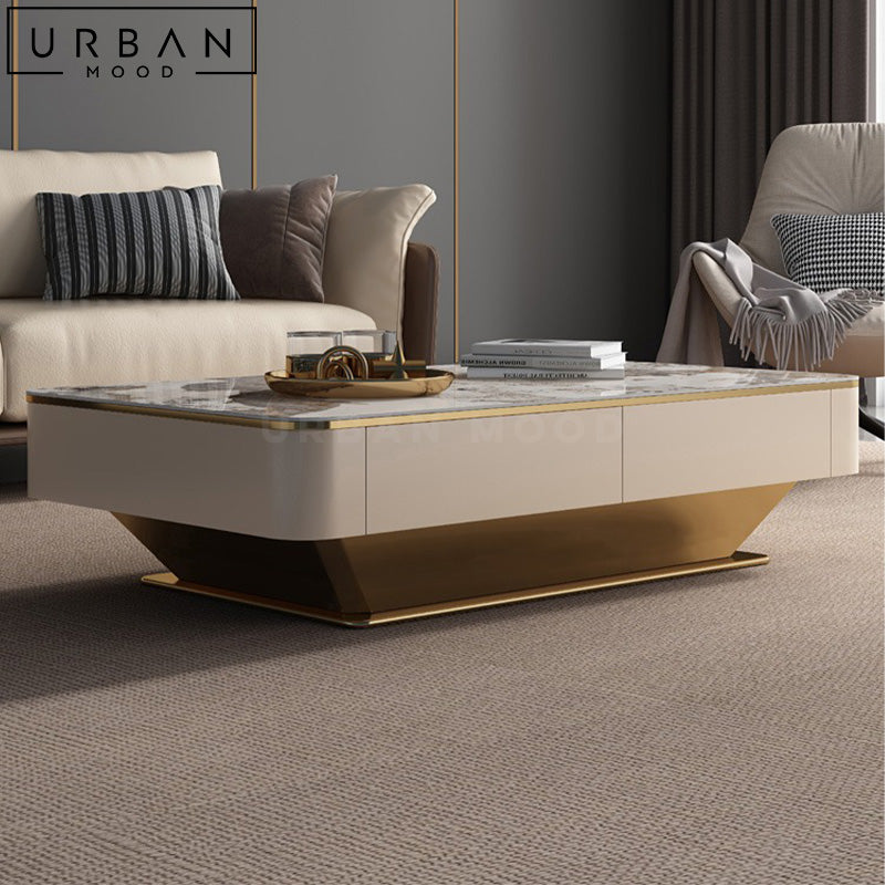Showcasing a sleek and clean-lined profile, our AISHA TV cabinet features a sintered stone top balanced upon spacious drawers for your media accessories. Founded upon a luxurious satin gold base, this TV stand lends a timeless look to any modern or Victorian living space. Complete with rounded corners ensuring children's safety, this console caters to both the young and old, while ensuring style is not compromised. Complete the look with our matching coffee table for a hotel-inspired vibe.