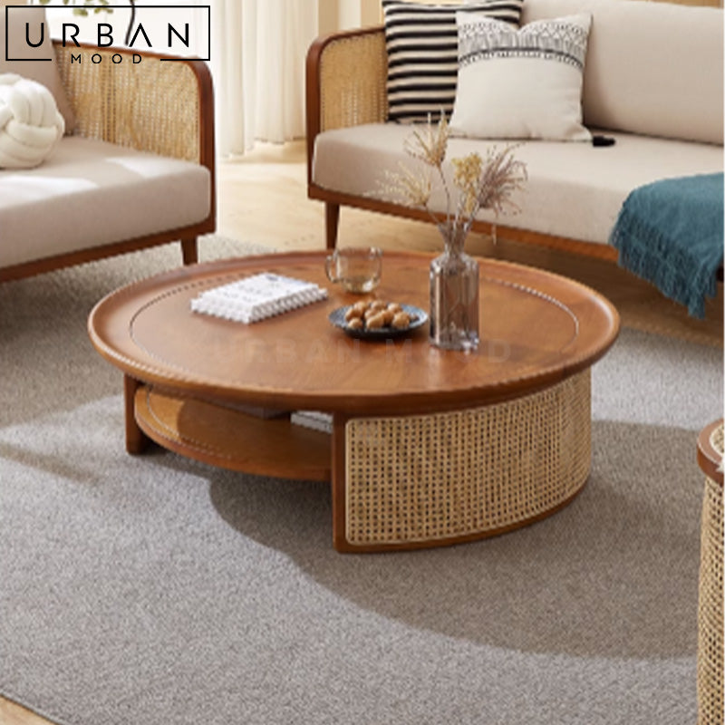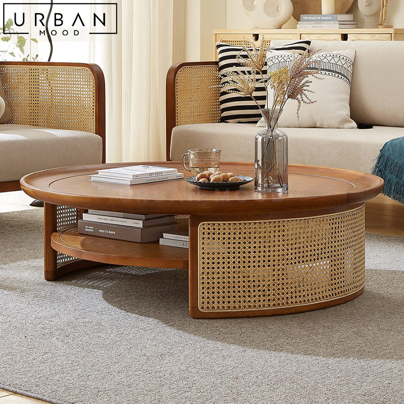 Inspired by Japandi design styles, our ALEXA coffee table showcases a sleek pine wood frame in a rich walnut stain, balanced atop a rattan frame that adds a rustic charm to any living space. With its spacious recessed table top, you have ample room to spread your decor, books, or magazines while keeping your essentials within easy reach. The clean-lined design adds a soothing vibe to any modern, Scandinavian, rustic, or cottage-inspired living room or office lounge.