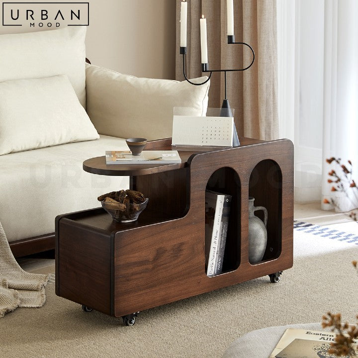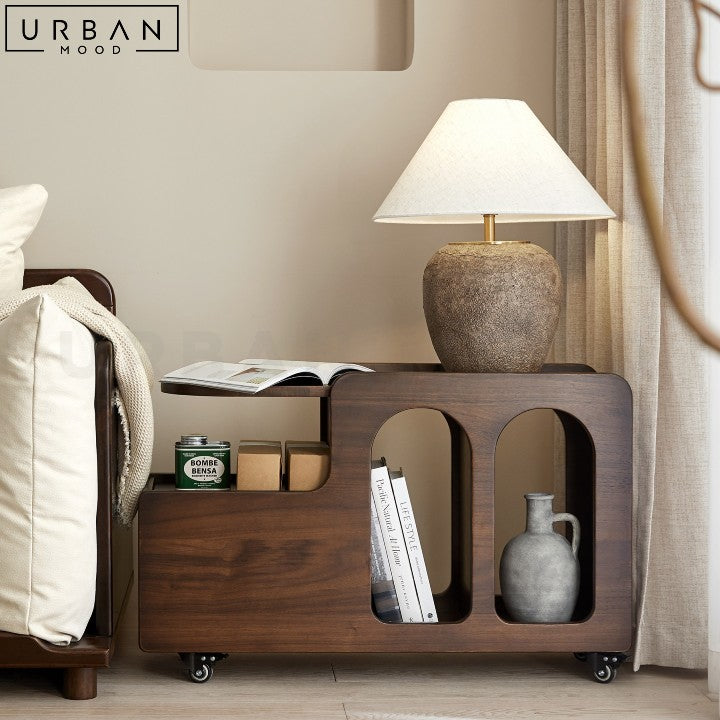 Crafted from walnut in a matte finish, our AMRIEL side table features beveled corners and arched niches for storage and display of your magazines and daily reads. Complete with wheels, this versatile storage unit goes anywhere with you, whether in your living room, bedroom, or home office. Designed to fit compact spaces, this side table will complement Japandi, rustic, or farmhouse inspired interiors.