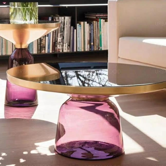 A stunning design inspired by Sebastian Herkner's the Bell Table, the Bellevue coffee and side tables challenge the material norms of a table by balancing a large round metal surface on hard blown glass. The glass base comes in an array of hues, adding a strong eclectic accent to any modern or luxurious settings.