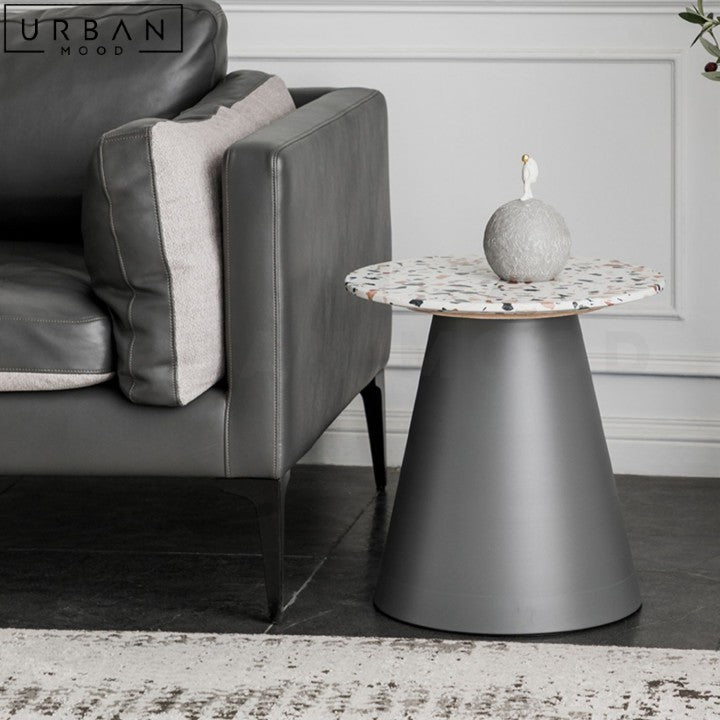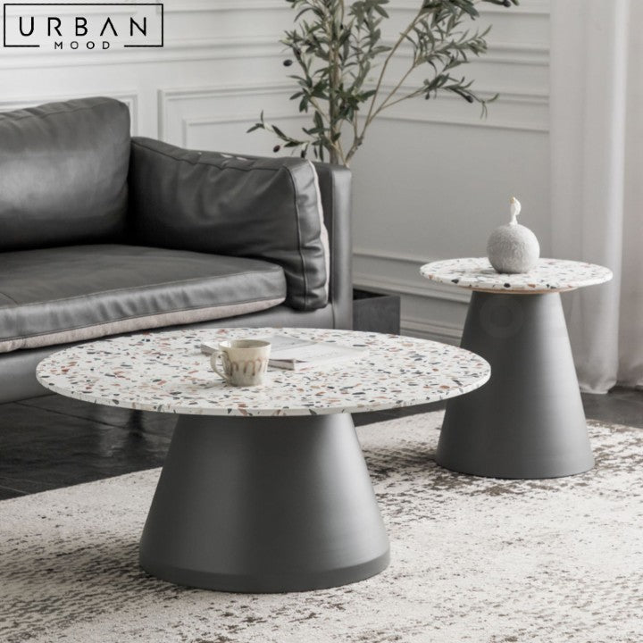 Complete your modern living room with our sleek BOUDICA coffee table, featuring a stunning Terrazzo table top and Black metal base. Its contemporary design and durable construction make it the perfect centerpiece for any modern space. Pair it with the matching side table for a cohesive look. The Terrazzo top adds a touch of elegance, while the black metal base provides a sturdy foundation. This stylish coffee table is perfect for relaxing and socializing, bringing a sophisticated atmosphere to your home. Its unique blend of materials makes it a standout piece of furniture for contemporary or eclectic interiors.