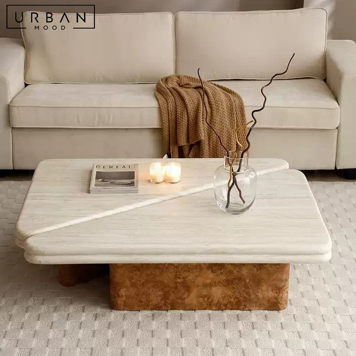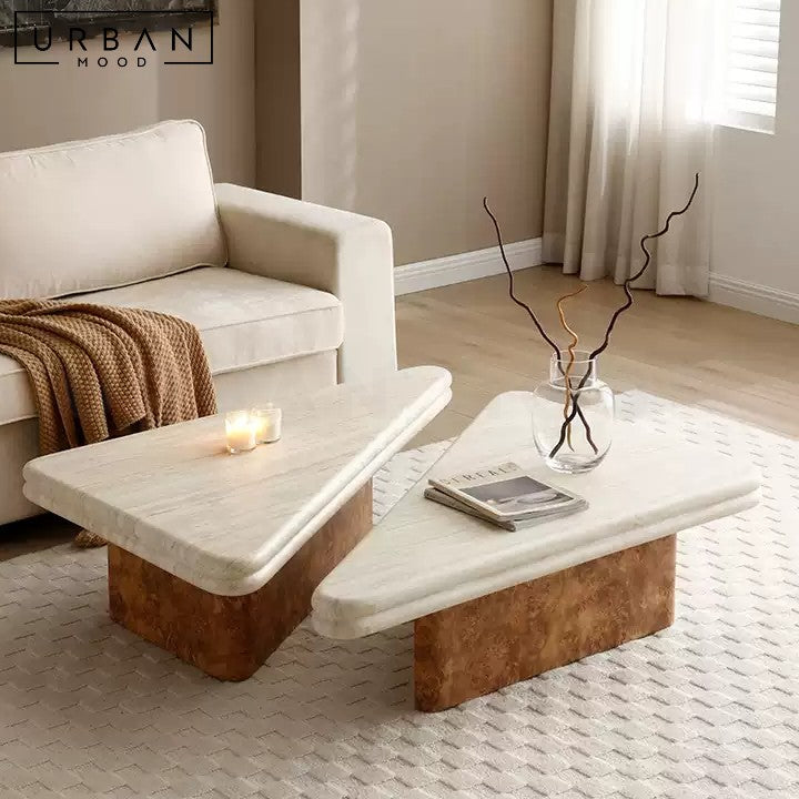 A conversation starter that will illuminatr any living or lounge room with its unique design, our BRIELLE centrr table is crafted from durable fiberglass in a travertine finish, providing an organic look that complements any Hygge or Muji décor. Comprising of two triangle-shaped table tops that can be joined to form a cohesive regular square top, these tables can be pulled apart for guests in large or small gatherings. Its walnut stained base adds a contrasting richness to any earthy themed interiors. Complete the look with our NAHLA rug for a wabi dabi vibe.
