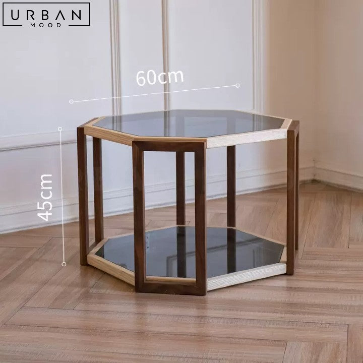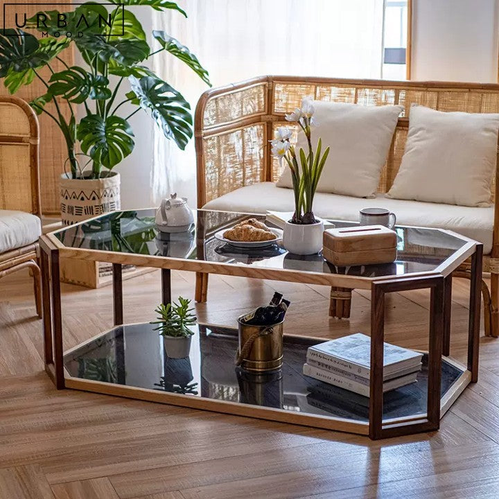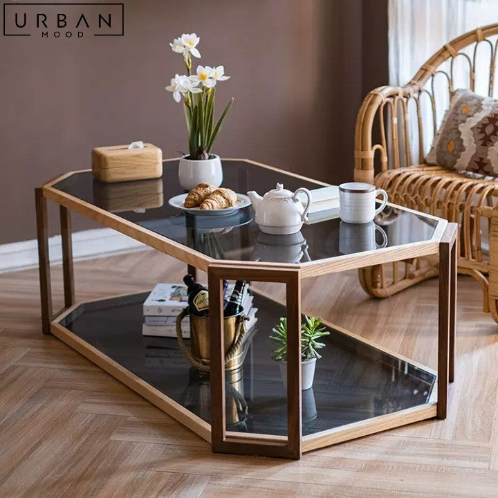 Make a statement in your living room with our BURREN coffee table. Featuring a tinted black glass top and an open glass shelf below, this table is supported by a sturdy wood frame in a unique polygon shape. The dark glass and wooden frame create a dramatic contrast, adding a touch of sophistication to your space. The open shelf provides a perfect spot for displaying books, magazines, or decorative items, while the polygon shape adds a geometric touch to your decor. Perfect for modern homes, this coffee table is sure to spark conversation and add a touch of glamour to your living room.