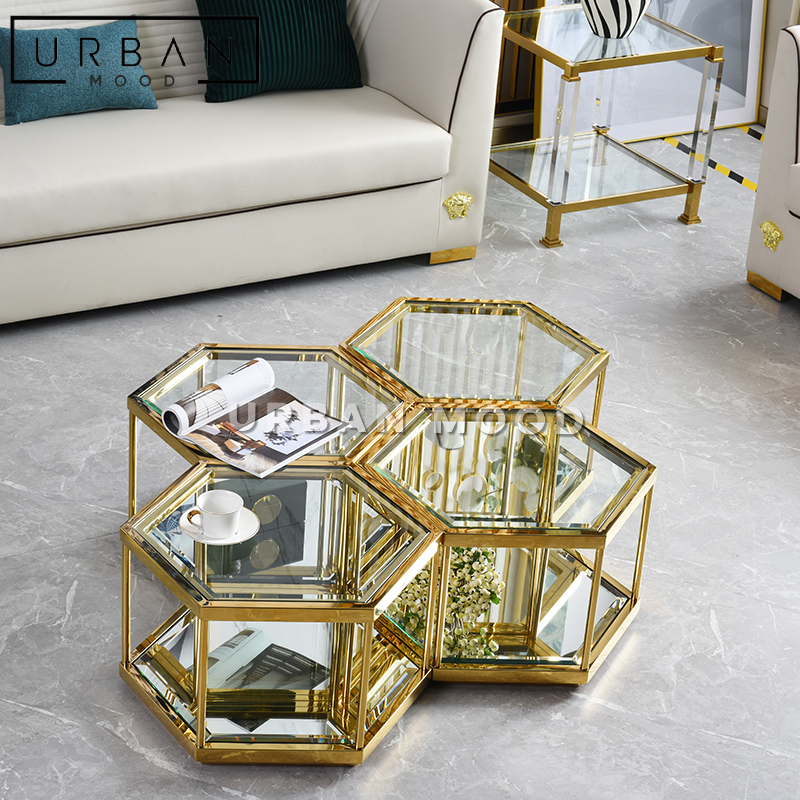 Founded atop a hexagonal frame in an electroplated gold finish, the CLEVIS modular coffee table is constructed from 3C tempered glass top and a mirrored base, adding a strong statement of class and luxury to any hotel-inspired family or lounge rooms. Get creative with these individual honeycombs to form a larger table top or pull them apart top use as side or end tables. Enjoy an instant touch of hotel luxury with the mirrored chrome effect.