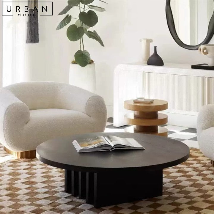 A masterpiece of modern design, our CORMACK coffee table is crafted from pine wood with a distinctive leg structure that adds a touch of sophistication to any room. The matte black finish gives it a sleek and contemporary look, perfect for noir-inspired interiors. The unique leg design creates a sense of visual interest, while the round top provides a spacious surface for coffee, conversation, and connection. This coffee table is a stylish addition to any living room, adding a touch of elegance and refinement to your contemporary decor. Its sleek design makes it a versatile piece that fits perfectly in any modern living space.