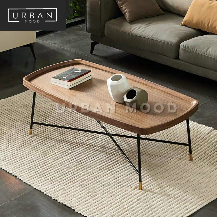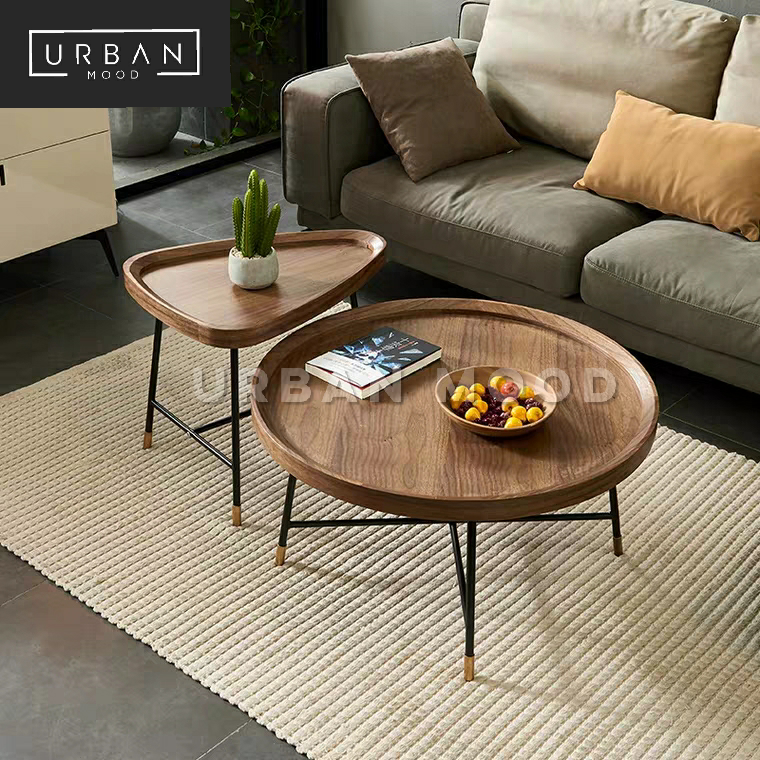 A serving table that combines tradition and modern concepts, the Davy coffee tables display thoughtful design in the form of a deep dish. Crafted from solid New Zealand pine, the table tops are stained a warm walnut in matte finishing. Fine powdercoated metal legs capped with gold-tone base complete the look. The tables come in three geometric choices - round, rectangular, and triangle. Mix and match for a contemporary look and pair the tables with our Posner modern sofa and a cream high pile rug for effect.