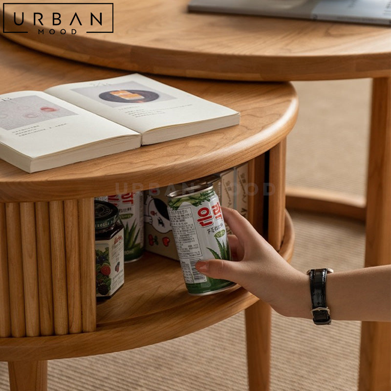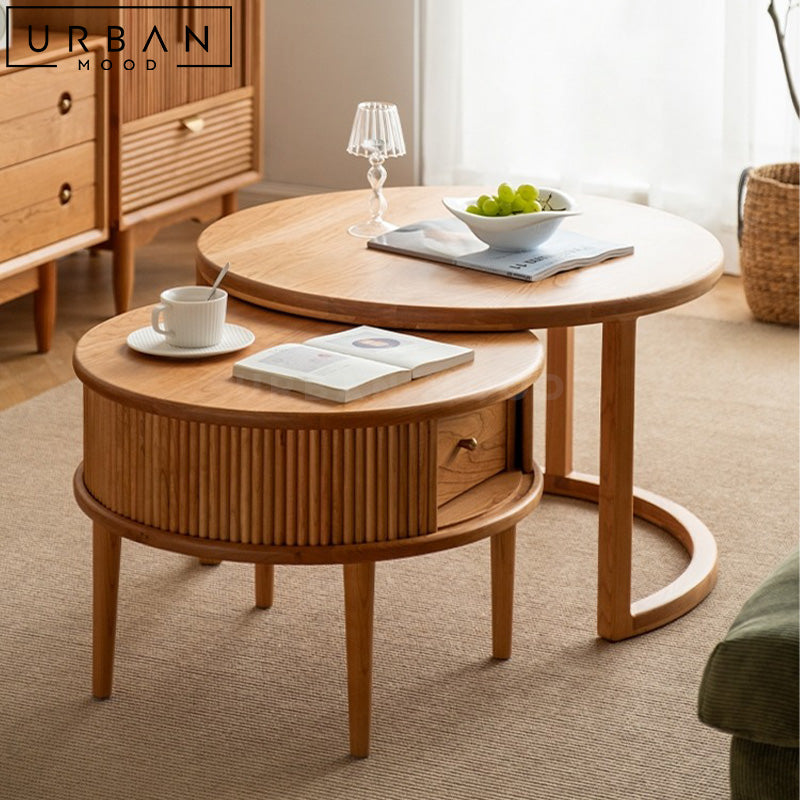 Crafted from premium cherry wood, our DOLF coffee table embodies the essence of Japanese style with its warm and inviting maple finish. The lower center table features a delightful drawer with a fluted sliding door—an intricate stall that adds to the distinctive design. Whether nested together or separated, these tables will add both form and functionality to any modern, rustic, vintage or Japandi-inspired living rooms.