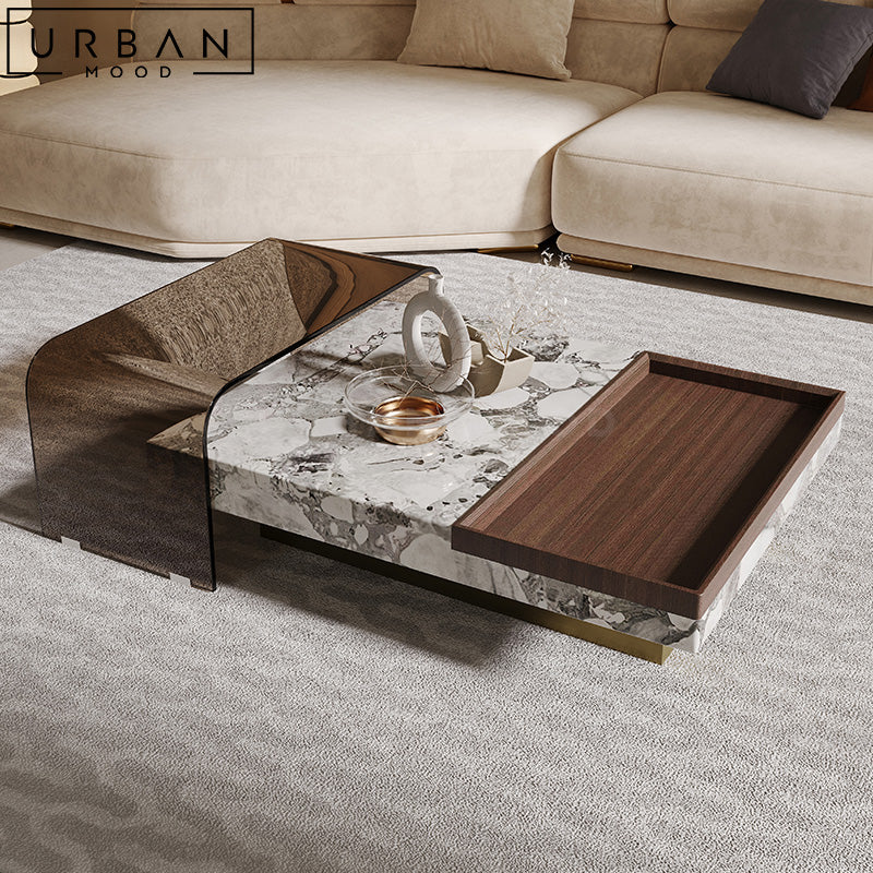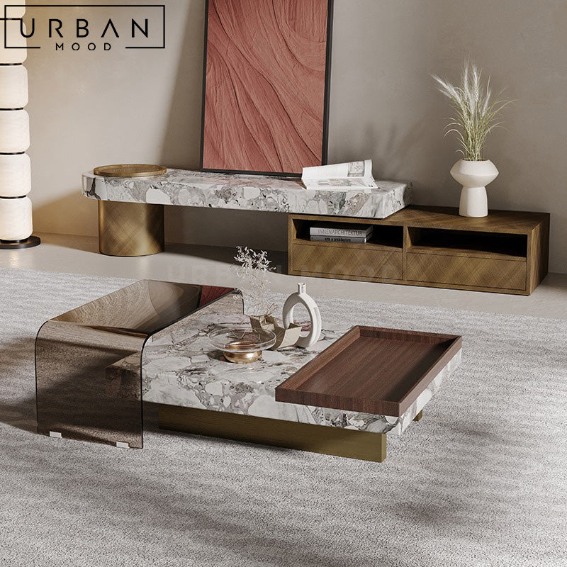 Grand and luxurious while remaining practical, the EDWARD coffee table showcases a full length engineered marble top in your choice of finishing, and a large recessed tray crafted from pine wood for your media accessories and afternoon snacks. Crafted with an attention-grabbing brushed gold metal base, this design exudes elegance and serves as a focal piece in any entertainment set up. Most ideal for modern, victorian or classic settings.