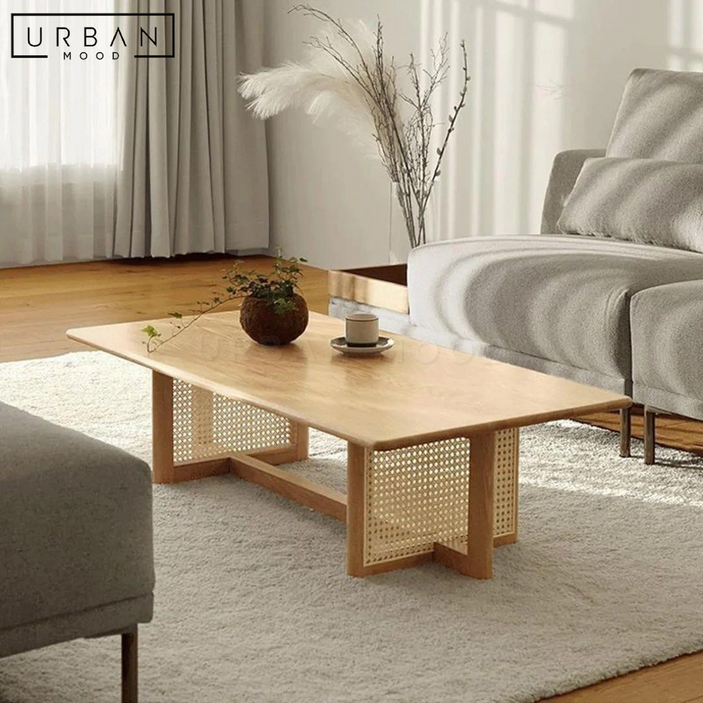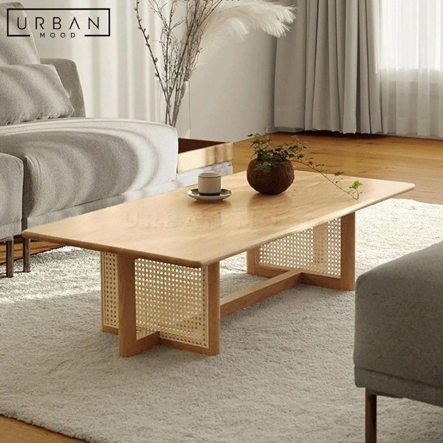 Inspired by Japandi design styles, our FUKO coffee table showcases a sleek pine wood frame in a light oak stain, balanced atop a rattan frame that adds a rustic charm to any living space. With its spacious table top, you have ample room to spread your decor, books, or magazines while keeping your essentials within easy reach. The clean-lined design adds a soothing vibe to any modern, Scandinavian, rustic, or cottage-inspired living room or office lounge.