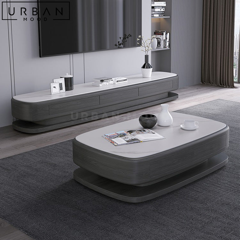 Our GARET TV stand and coffee table will make the perfect addition to modern living room. Crafted from E1 high-density fiberboard in an ash grey wood veneer, this TV cabinet is sure to last for years to come. Choose from white marble or grey slate for the table surface to complement your modern, industrial, or contemporary living room interior. Rounded edges and corners make it kid friendly, ensuring safety for both family and guests. With its edgy and modern design, this TV console and coffee table is sure to make a statement in any home.