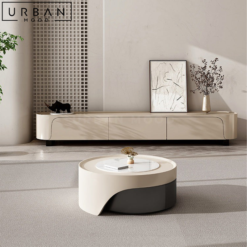 Enhance your living space with our GEMMA modern TV console and coffee table. Crafted from high-quality fiberboard, this versatile pair effortlessly combines contemporary, minimalist, industrial, and eclectic styles. These pieces showcase a harmonious blend of functionality and aesthetics, making them the ideal choice for your home. Dive into the world of modern furniture and infuse your space with the perfect combination of sophistication and style. This TV cabinet set is the perfect addition for a unique and stylish atmosphere in your modern, Japandi, or hygge living area.