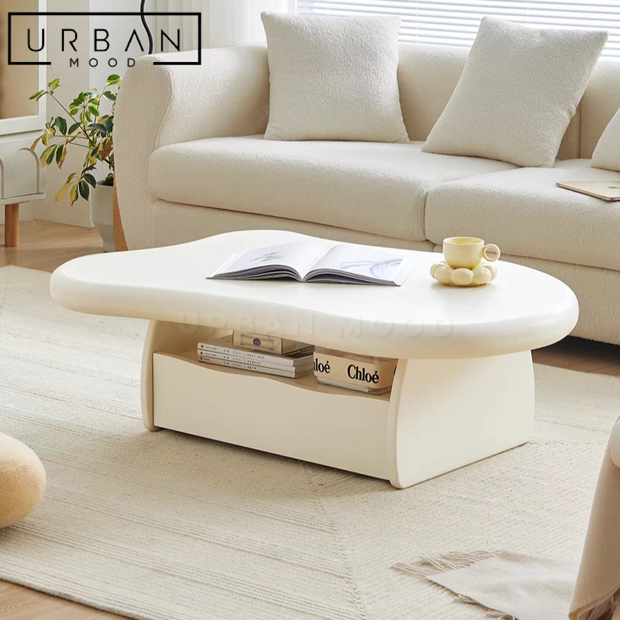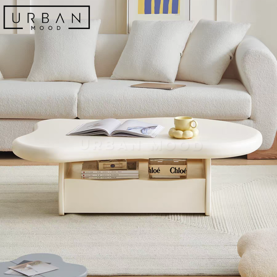 Inspired by the Japandi interior style, our ISSEY coffee table showcases a whimsical irregular cloud-like shape, adding artistic charm to any room. Crafted with high-quality fiberboard, the table surface is both smooth and sleek, ensuring durability. This statement piece harmonizes with various interior styles, combining Japanese simplicity with Scandinavian warmth. Perfect for both everyday use and intimate gatherings, this coffee table will be the centerpiece of your living space.