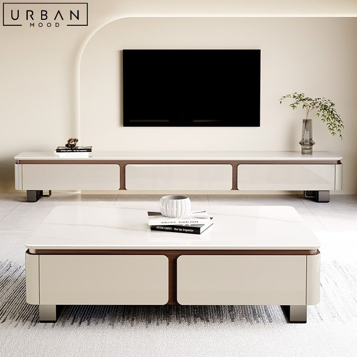 Enhance your living room with the JUSTINA TV cabinet. Crafted from durable multilayer board, this console boasts a sleek, contemporary design perfect for any modern decor. It offers ample storage space for media devices, accessories, and decor items, combining functionality with style. This TV stand's clean lines and sintered stone top make it a chic addition to your modern or classic home entertainment setup.