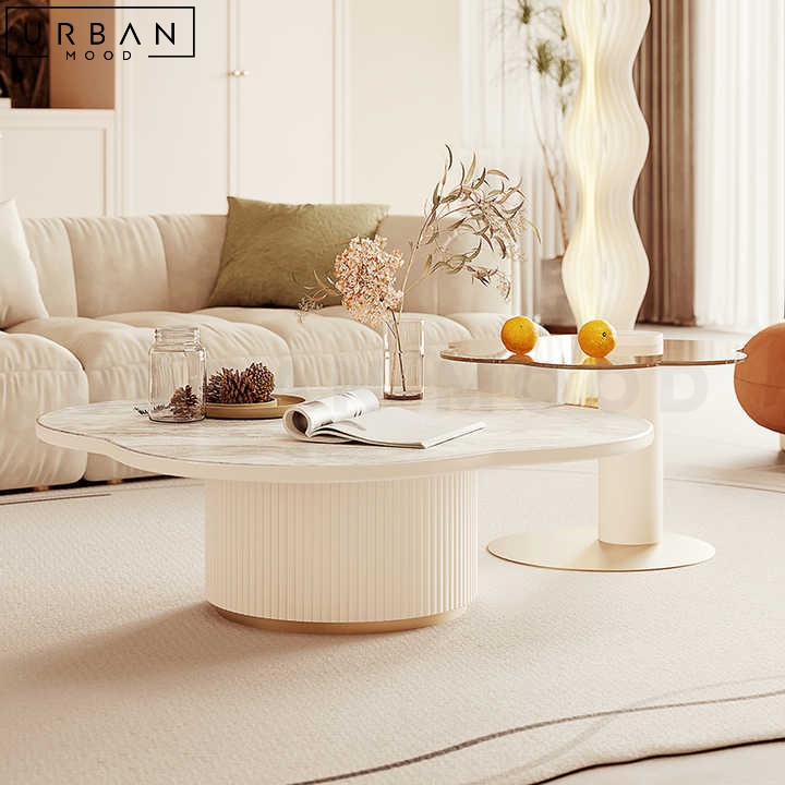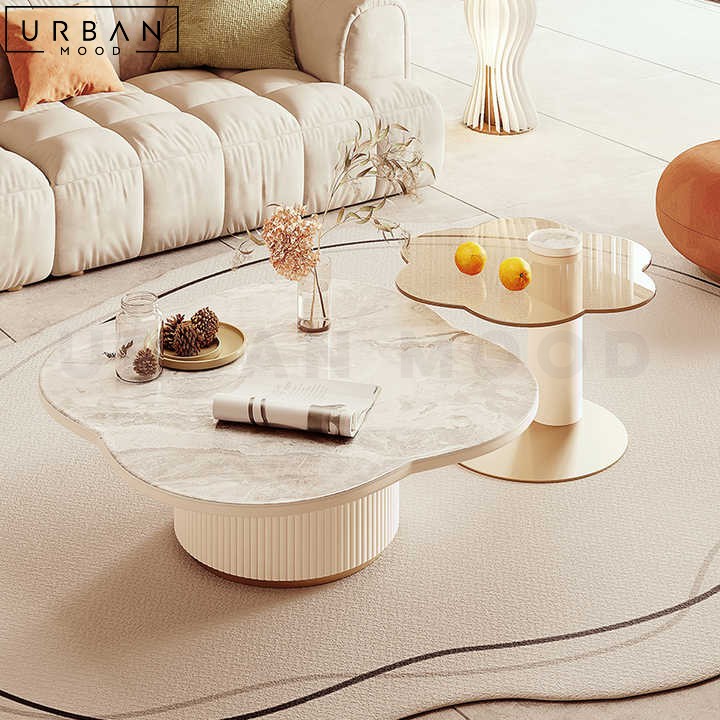 Invite nature into your living room with our KINSLEY flower-shaped nesting coffee tables, perfect for embracing Japandi or Hygge style. The main table features a beautiful sintered stone top in high gloss marble print, while the side table boasts a sleek tempered glass top. The nesting design allows for flexible configuration, enabling you to pull the tables apart to create a spacious setting or push them together for a cozy atmosphere. This versatile set combines functionality and style, making it perfect for everyday relaxation or entertaining guests. Its distinctive flower shape and premium materials will surely become a conversation starter in your home.
