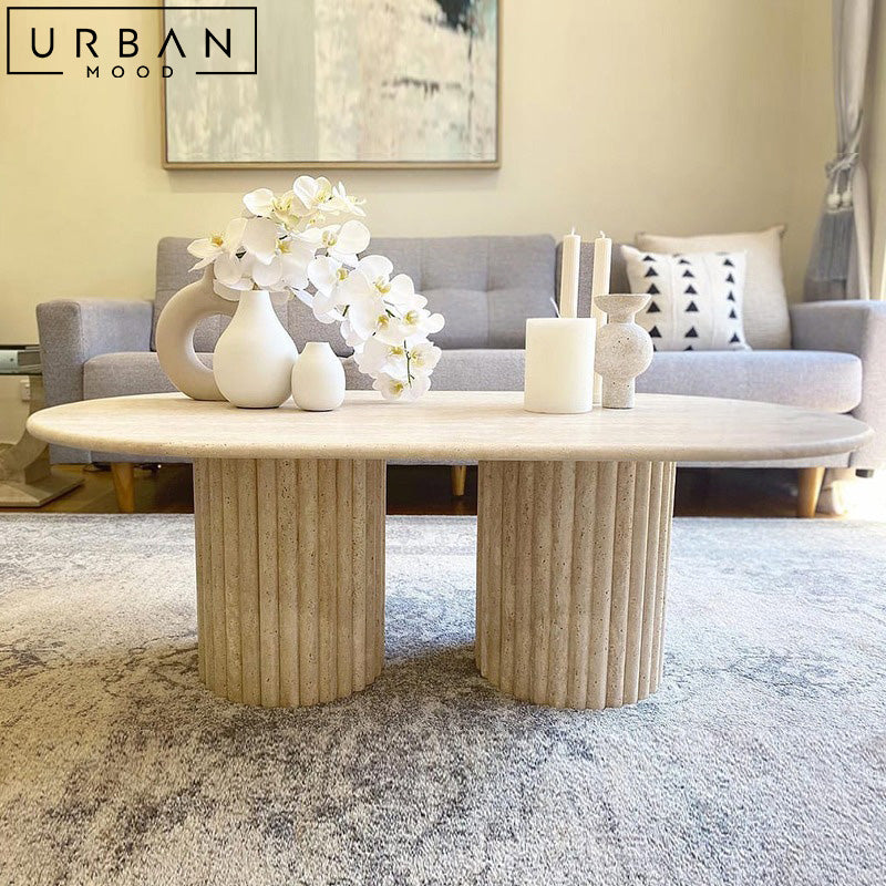 Our LARIA coffee table features a sleek modern design, combining the timeless elegance of travertine with contemporary styling. Its organic textured surface adds a striking touch to your home decor, while the sturdy construction ensures both style and functionality. The LARIA coffee table seamlessly integrates into any modern, classic, or wabi sabi space, offering a modern, sophisticated focal point. Redefine your living room with this remarkable piece, creating a perfect blend of style and durability that complements your interior.