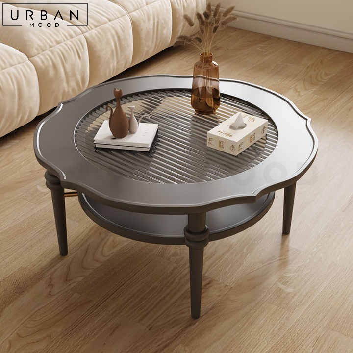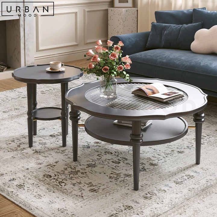Add vintage charm to your living room with our LOROS coffee table. The black frame and decorative carved legs create a contrasting base, while the ribbed glass table top adds a touch of elegance. Shaped like a flower, the table top brings a whimsical touch to your decor. The open shelf below provides a convenient spot for storing books, magazines, or decorative items. Crafted from high-quality rubber wood, this table boasts a durable construction and a distinctive vintage design that will complement any eclectic or French-inspired decor.