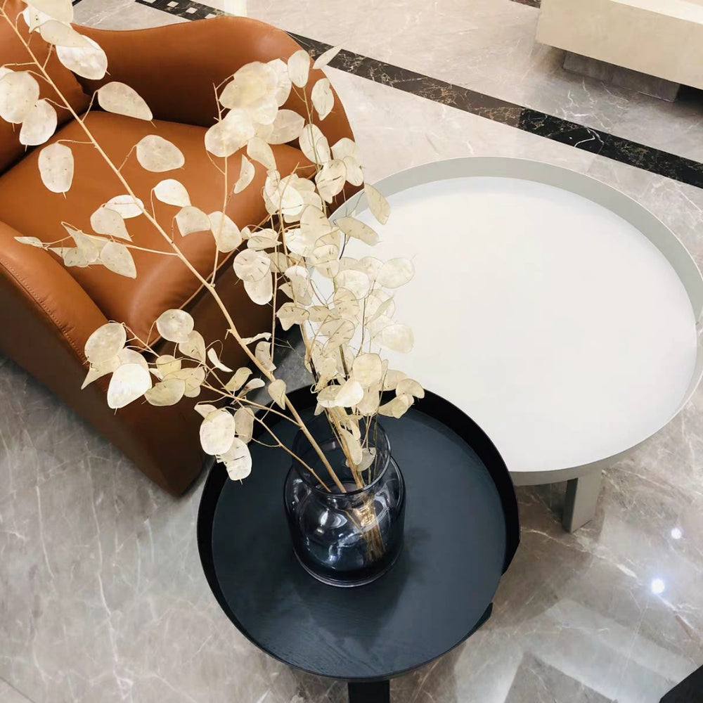 Create an illusion of wide livable space with this two-piece nesting table set. Crafted from manufactured wood and wrapped with a beautiful wood grain veneer, this modern and sheet thin design features a spacious round top balanced by four flared and sleek wooden legs.