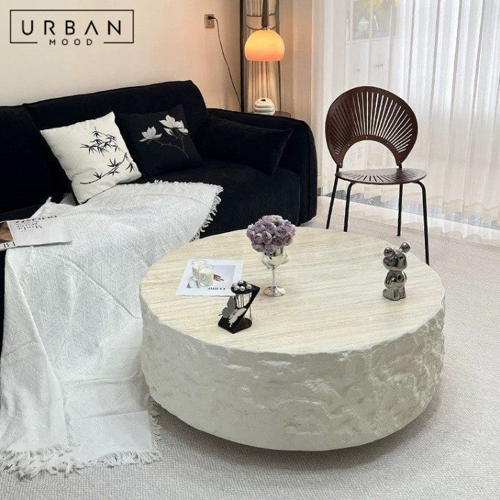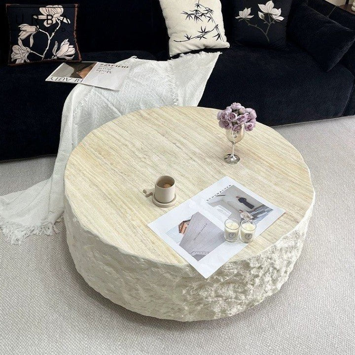 Crafted with durable fiberglass, this unforgettable centerpiece showcases an intentionally raw silhouette that instantly adds a touch of nature and authenticity to any living space. Its rounded shape provides a balanced and welcoming centerpiece for social gatherings or relaxed evenings. The travertine material adds texture and an organic aesthetic to any Wabi Sabi, Muji, or Aesop inspired space. Complete the look with our electric recliner sofa, for a lifetime of comfort and luxury.