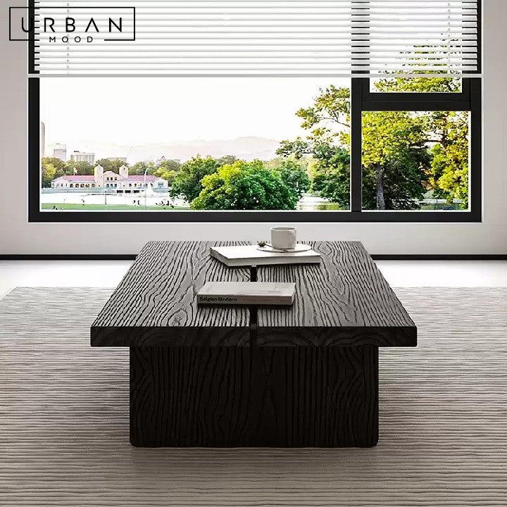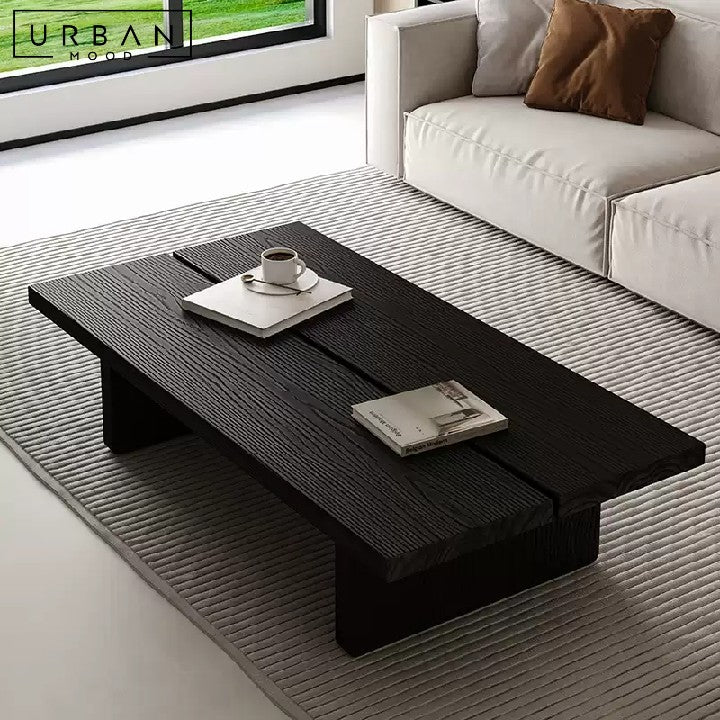 Our NGUYEN center table is crafted from pine wood in a bold black finish, its significant wood grains embodying the beauty of imperfections inherent to the Wabi-sabi style. Featuring a radical split line down its middle, this table offers a contemporary design that will sit well in art deco or noir living spaces.