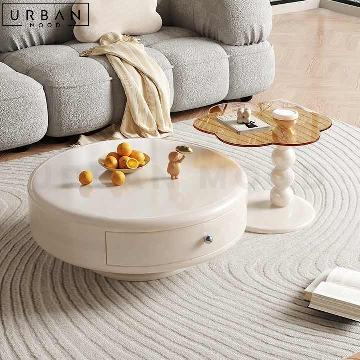 Complete your Japandi-inspired living room with our NISSA round coffee table and matching flower-shaped side table. The coffee table features a milky white finish, a deep drawer for storage, and a sleek swivel base for effortless movement. Pair it with the charming side table, boasting an amber-tinted glass top in a beautiful flower shape. The combination creates a harmonious and inviting atmosphere, perfect for cozy gatherings or everyday relaxation. The Japandi style's emphasis on minimalism and natural beauty shines through in this pairing, bringing a sense of serenity and warmth to any Hygge or Wabi Sabi inspired homes.