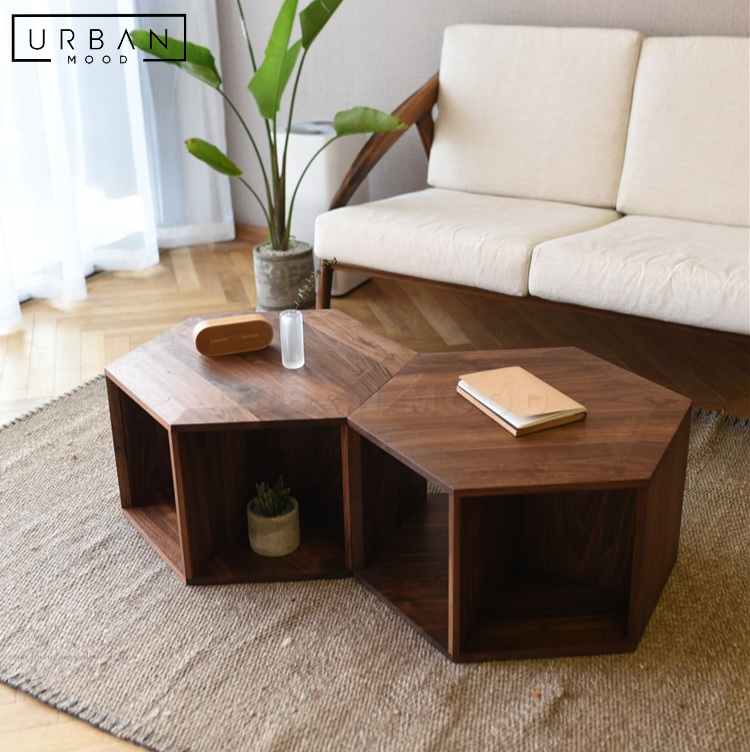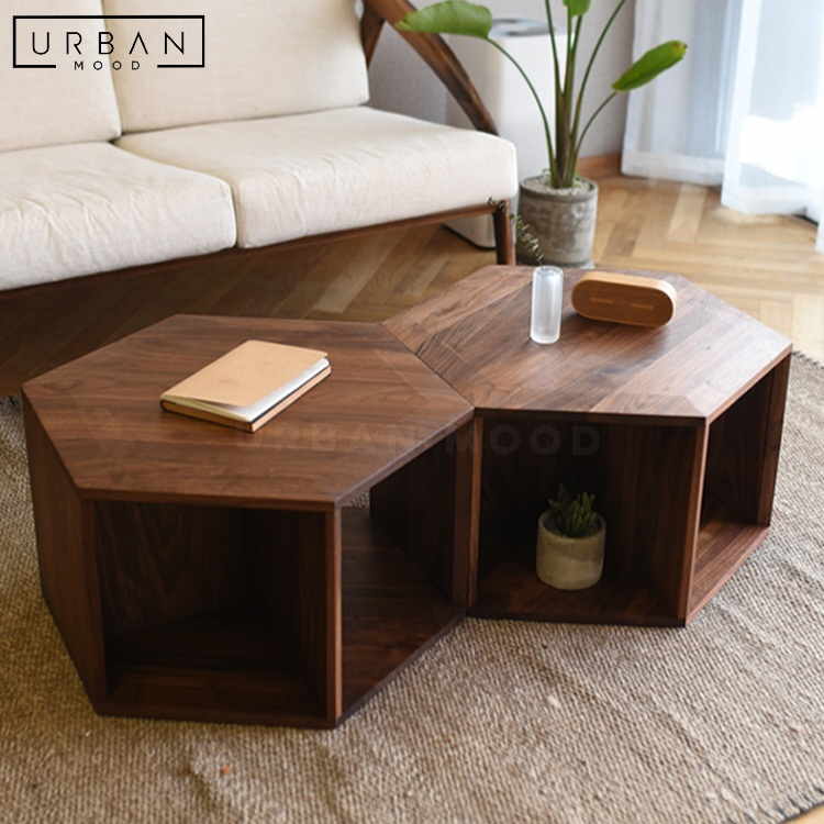 Shape your style with our modular honeycomb-shaped OAKEN coffee table, handcrafted from premium walnut wood in a dark walnut finish. Combine multiple units to create a unique centerpiece that adapts to your needs. Each unit boasts a unique hollow shelf beneath, offering storage for your magazines, media accessories, and more. This versatile coffee table invites you to explore endless arrangement possibilities, to complement your modern, rustic, or Japandi interiors.