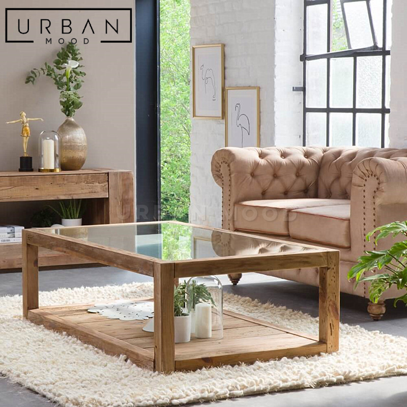 Perfect for a cozy living room, lounge room, or entertainment room, the OAKHAM large rustic coffee table stands out from the rest of the furniture with its aged wooden grains and see-through glass top. Built from New Zealand pine wood, the table features natural knots, adding to its rustic style. Complete the look with a high pile rug and our Chesterfield sofa range for a regal, homely ambience.