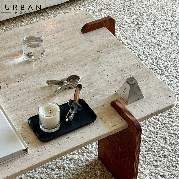 Add warmth and character to your living space with our PAU travertine coffee table. Embracing the beauty of imperfection, this Wabi-Sabi inspired piece features a unique, natural stone top with subtle veining and texture. Supported by sturdy rectangular Walnut legs, this table exudes a sense of organic elegance. Perfect for those who appreciate the beauty of imperfection, this coffee table brings a touch of earthy sophistication to any room. Its distinctive design and premium materials make it a standout piece in your home decor, inviting conversation and connection with its unique, natural beauty.