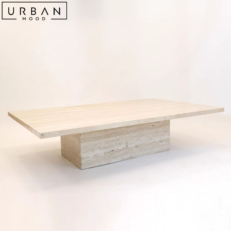 Crafted from natural travertine, our PINO coffee table is a stunning design in an organic nude tone, serving as both a centerpiece coffee table and an accent table, adding functionality and style to your living space. Whether as a striking centerpiece in your living room or an artistic accent in your office lobby, this outstanding table makes it a conversation starter in any setting. Create an ambiance of artistic flair in your modern, minimalist, or contemporary home yet not compromising on practicality with this multifunctional coffee table.