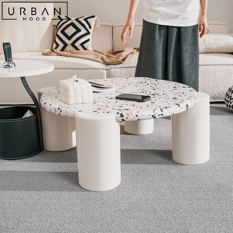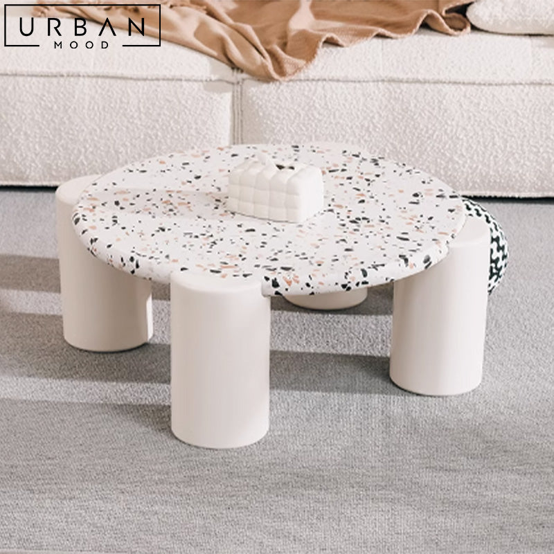 A definite statement piece in any living room or office lounge, our POMMEL coffee table features a round terrazzo table top supported by sturdy pine wood legs in a matte white finish. The terrazzo tabletop, with its mosaic-like patterns, adds a dash of artistic sophistication to any room while its durability ensures it is built to last through the years. Most fitting for eclectic, minimalist or Muji-style interiors, this table will be sure to spark conversations amongst friends and guests.