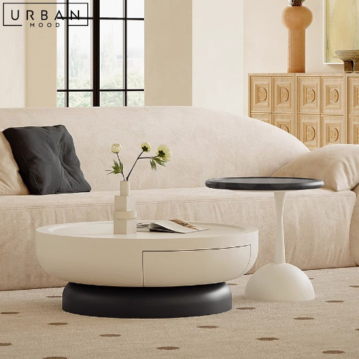 Accentuate your living room with our REBECCA round coffee table in a matte milky white finish. This modern piece features a convenient drawer for storing essentials, keeping your space organized and clutter-free. Its monochromatic design makes it easy to pair with a matching side table, creating a cohesive and sophisticated look. Perfect for modern interiors, this coffee table adds a touch of elegance and refinement, while its minimalist aesthetic ensures it won't compete with other design elements. Its sleek finish and curved silhouette make it a stylish centerpiece for any modern or Japandi interiors.