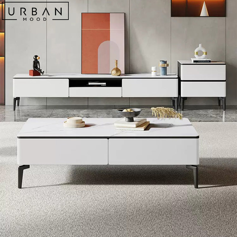 Featuring an open central shelf integrated for media connectivity and accompanied by pine wood drawers on either side, our ROSSI TV cabinet offers both functionality and style. Drawers are constructed from durable pine wood, providing ample storage for media accessories and cables. Complementing the clean-lined cabinet are sleek tapered black metal legs that ensure your robot vacuum has full access for maintenance. Perfect for contemporary and minimalist interiors, this TV stand will withstand the test of time with its durable sintered stone top, perfect for displaying your frames and ornaments.