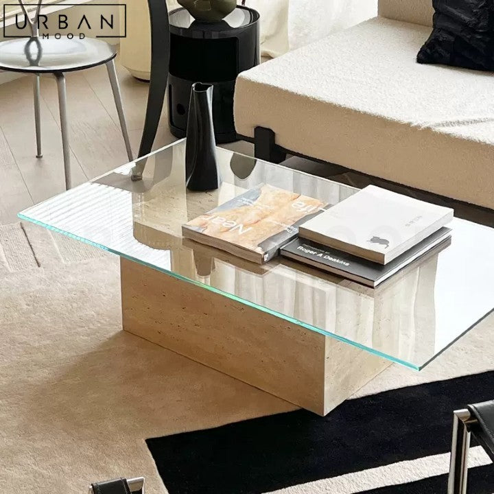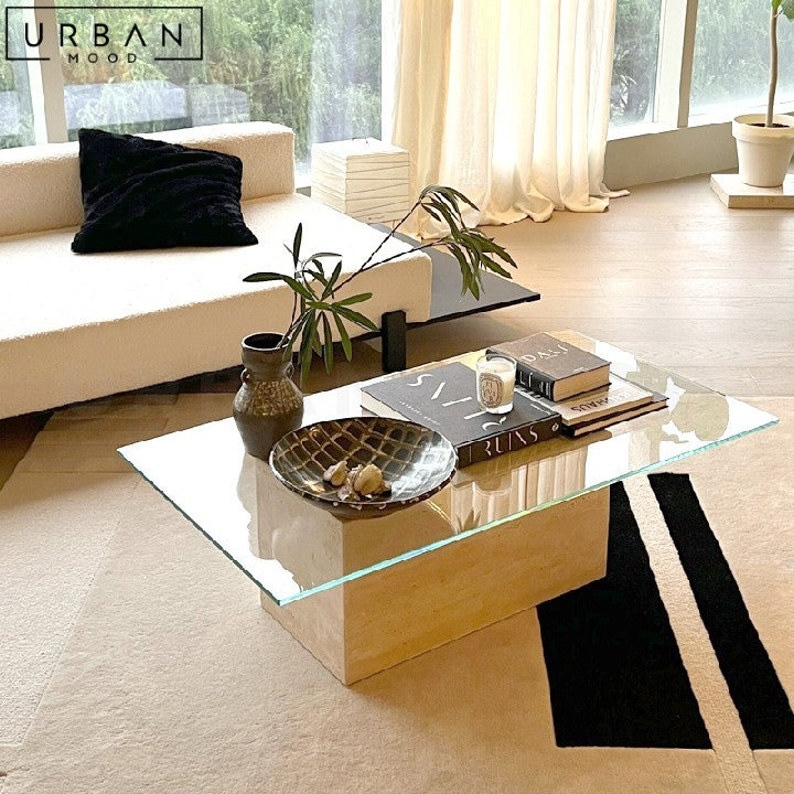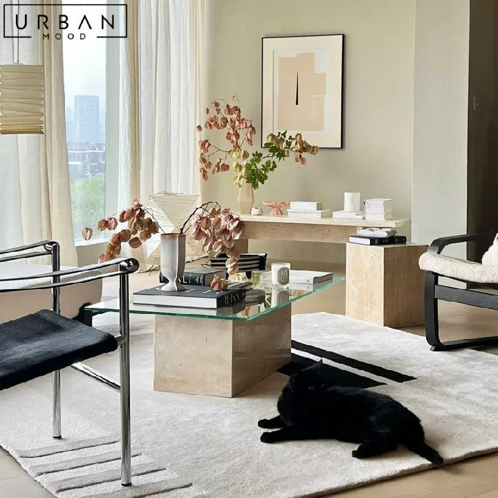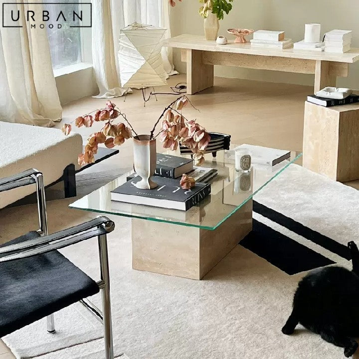 Bring the beauty of natural imperfection to your living room with our stunning SHAW coffee table, expertly crafted in Wabi Sabi style. The rectangular travertine base, with its unique veining and subtle imperfections, supports a sleek glass top, creating a striking contrast of textures. Perfect for those who embrace the art of imperfection, this table adds warmth and character to any Hygge or Japandi living space. Its organic, earthy feel complements bohemian, rustic, or minimalist decor, while the glass top provides a touch of modern sophistication.