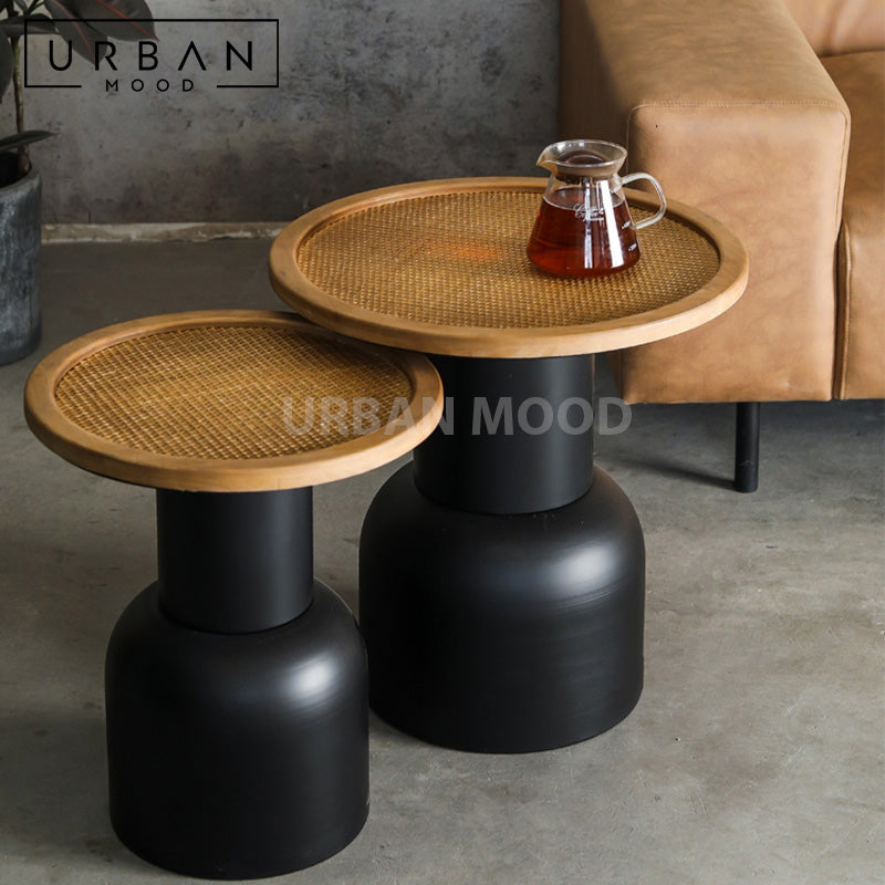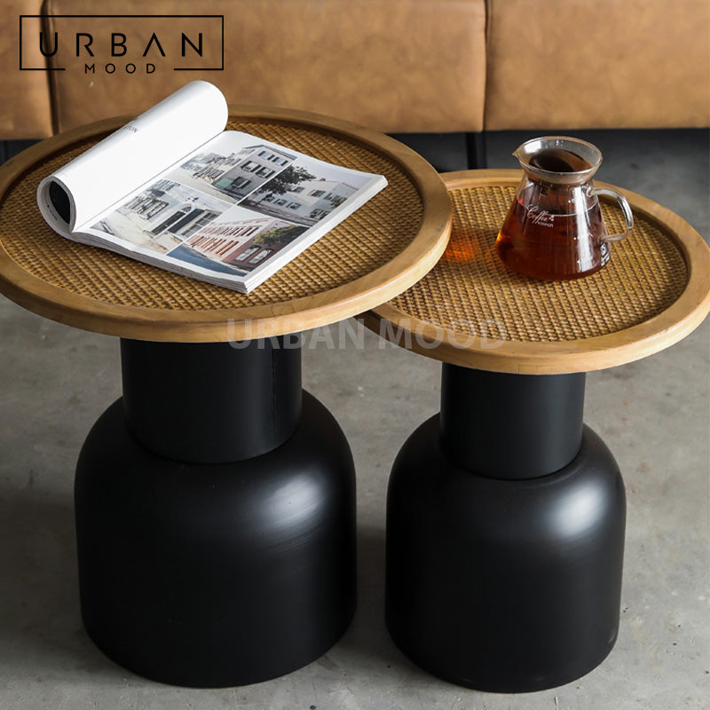 Crafted with an organic rattan table top, our SKEY side table adds rustic charm to any vintage, cottage inspired, or Japandi living room or lounge room. The distinctive bell-shaped metal base adds an industrial touch, acting as a contrast against the warmth of rattan. Whether you're sipping morning tea or hosting guests, this side table offers a timeless accent that embodies elegance and character.
