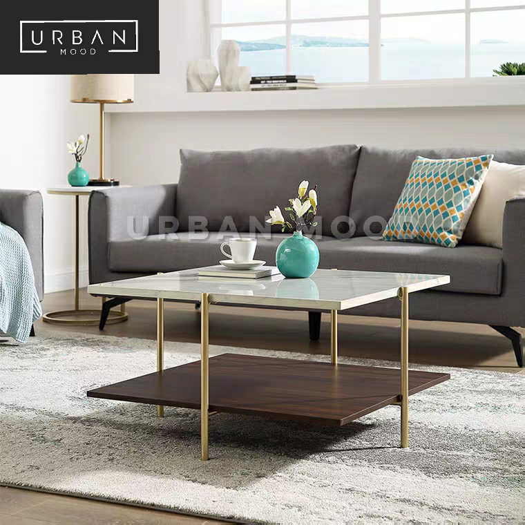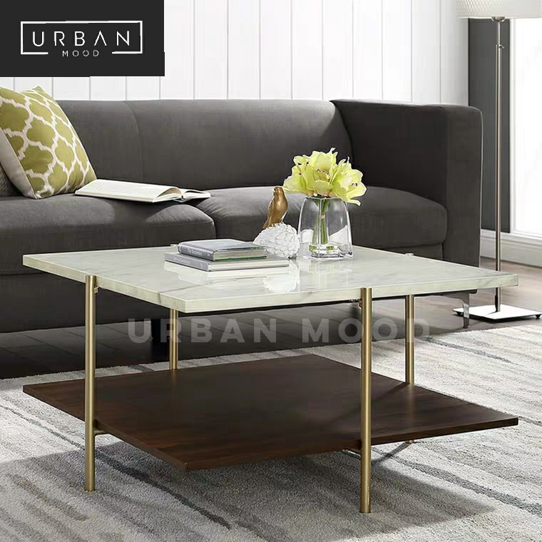 An edgy but functional update on the contemporary style, this ultra sleek and minimal design combines all three elements of wood, metal and marble to produce a design that complements almost any interior styles. Held on four sides by brass rods in a powder-coated finish, the two tier table tops provide structure as a focal piece in your entertainment space. Round out the angular piece with a high pile rug and a chesterfield three seater sofa.