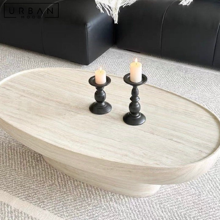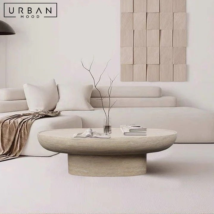 Crafted with a fibreglass base and a smooth travertine top, our TOLOZA centre table blends Wabi Sabi design influences with natural beauty. Its organic material makes it an ideal addition to Japandi and Hygge homes, while the durable material ensure long-lasting appeal. Complete the look with our RENAIS couch.